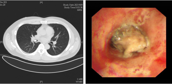近日,34岁的李先生在吃饭时不小心将食物吸到了气管里,随后出现持续性剧烈干咳,少量咯血,呼吸时气短,并能听到胸腔内的哮鸣音。李先生赶紧来到清华大学附属北京清华长庚医院急诊科就诊,胸部CT检查显示右主支气管内高密度异物影。急诊医师立刻联系呼吸与危重症医学科紧急会诊,主治医师赵景全看到李先生的影像后,考虑气道异物较大,立刻为患者联系安排紧急气管镜检查,探查可见患者右中间段支气管内有一灰褐色异物,呈现不规则形态,几乎完全阻塞了支气管管腔,与支气管嵌顿紧密,远端气道无法窥及。