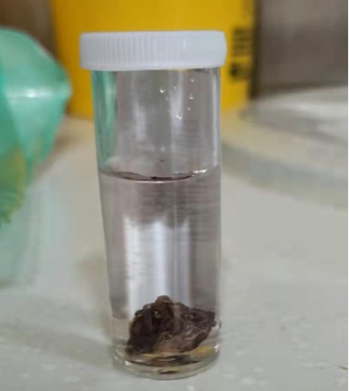 在呼吸与危重症医学科主任医师郭军的带领下,主治医师李理、医师高博、护师白凤辉协作配合,应用冷冻探头冻取异物,配合圈套器将异物送至口咽,后在耳鼻咽喉头颈外科医师曹鑫、张云云的协助下钳夹取出口咽部,卡在气管的异物终于露出了真面目——竟然是一块肉骨头!