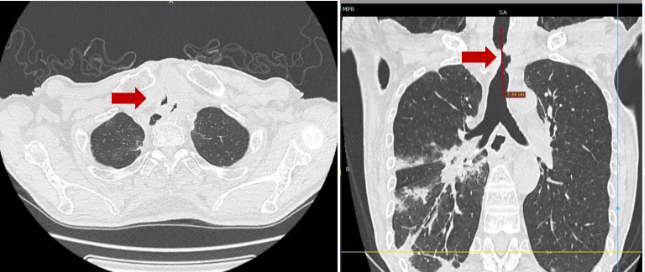 胸部CT显示气管局部肿物,大气道狭窄最严重处(红色箭头处)仅4mm