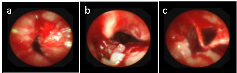 气管狭窄在颈部及胸部恶性肿瘤患者中很常见,由于恶性肿瘤生长速度快,常常侵犯气管导致复杂的气管狭窄,患者会出现较重的呼吸困难,是一种严重的临床急危重症,常会导致患者死亡。刘先生曾因食管癌进行过两次手术,影像结果显示食管癌转移到气管,导致气管管腔重度狭窄,最严重处直径仅4mm左右,狭窄段则长约3-4cm,气管镜下可见菜花样新生物的同时还伴有表面渗血、黏膜坏死,到院就诊时,已经出现了典型的“三凹征”,即吸气时胸骨上窝、锁骨上窝、肋间隙也出现了明显凹陷,提示刘先生严重呼吸困难。若不及时治疗,他随时可能因为痰堵窒息或呼吸衰竭导致生命意外。