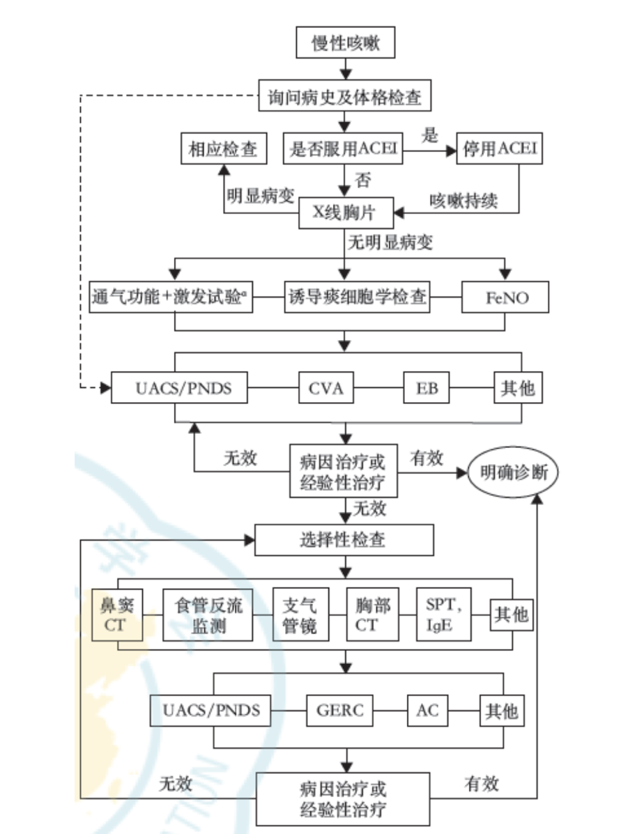 根据引起慢性咳嗽的各种病因进行全面的辅助检查,如鼻旁窦X线片、肺通气功能、支气管舒张或激发试验、诱导痰细胞分析、呼出气一氧化氮检测、食管阻抗-pH监测、纤维支气管镜和胸部CT等,依据检查结果结合病史建立可能的病因诊断,再进行相应的病因治疗,如咳嗽缓解或消失就证实诊断,治疗失败则排除诊断(具体见流程图1)。