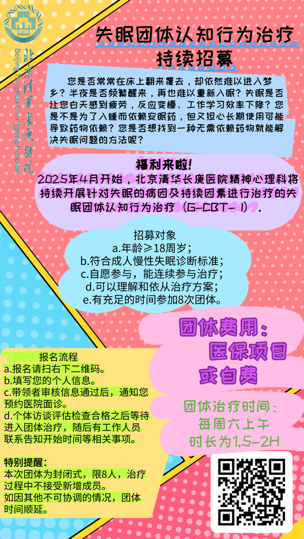 早醒从来不应被简单地归结为“懒惰”或“意志薄弱”。它是身体向我们发出的求救信号,提醒我们需要关注自身的心理健康。只有正视和了解这些信号,才能及时寻求专业帮助,走出情绪低谷,迎接阳光灿烂的每一天。北京清华长庚医院精神心理科特别推出心理团体治疗项目,旨在为早醒及情绪问题患者搭建一个支持与分享的平台。主要特色:在团体环境中,参与者可以分享情绪、失眠的经历、倾诉内心感受,同时接受专业心理医师的引导和调控(招募详情见如下海报)