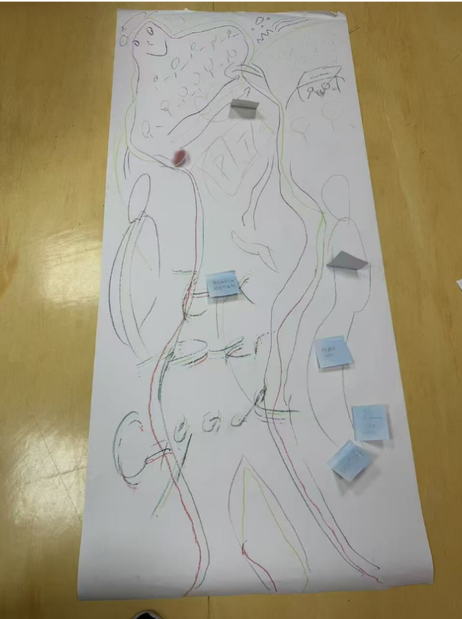 由于团体成员长期承受身体压力,日常生活中常表现为身体疼痛,如耳鸣、头痛、胸闷、心悸、腹痛等。心理咨询师先引导参与者进入冥想状态,再借助 OH 卡与压力事件建立连接,使其充分想象压力的形态,细致观察和感受内心的情绪与压力。随后,参与者将感知到的情绪与身体紧张区域,用鲜艳色彩、流畅线条和简洁文字标记出来。这一创作过程不仅帮助他们深入理解身体感受,还激发了对自我情绪的关注与表达,促进了心理层面的自我探索与释放。团体治疗中,部分参与者在绘画身体某一部位时会掩面痛哭,坦言 “这是一种失控的感觉,我感觉好难受”。有时,过往发生的负面事件难以直接描述,而艺术疗愈能让参与者逐步贴近真实的情绪与心理感受,更直观地 “看见” 自我。