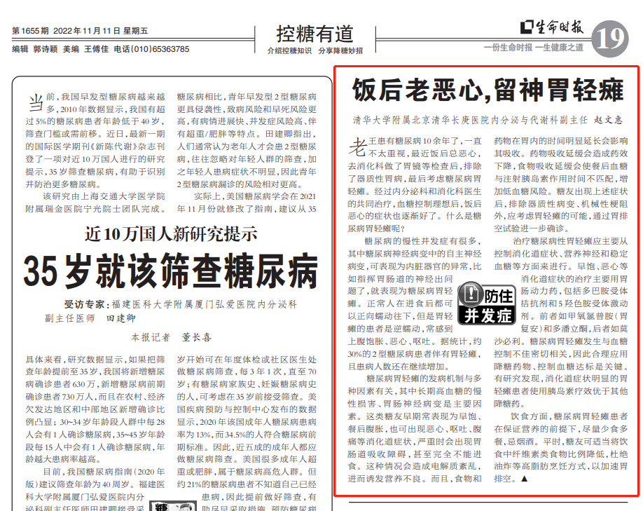 糖尿病胃轻瘫的发病机制与多种因素有关,其中长期高血糖的慢性损害、胃肠神经病变是主要因素。这类糖友早期常表现为早饱、餐后腹胀,也可出现恶心、呕吐、腹痛等消化道症状,严重时会出现胃肠道吸收障碍,甚至完全不能进食。这种情况会造成电解质紊乱,进而诱发营养不良。而且,食物和药物在胃内的时间明显延长会影响其吸收。药物吸收延缓会造成药效下降,食物吸收延缓会使餐后血糖与注射胰岛素作用时间不匹配,增加低血糖风险。糖友出现上述症状后,排除器质性病变、机械性梗阻外,应考虑胃轻瘫的可能,通过胃排空试验进一步确诊。