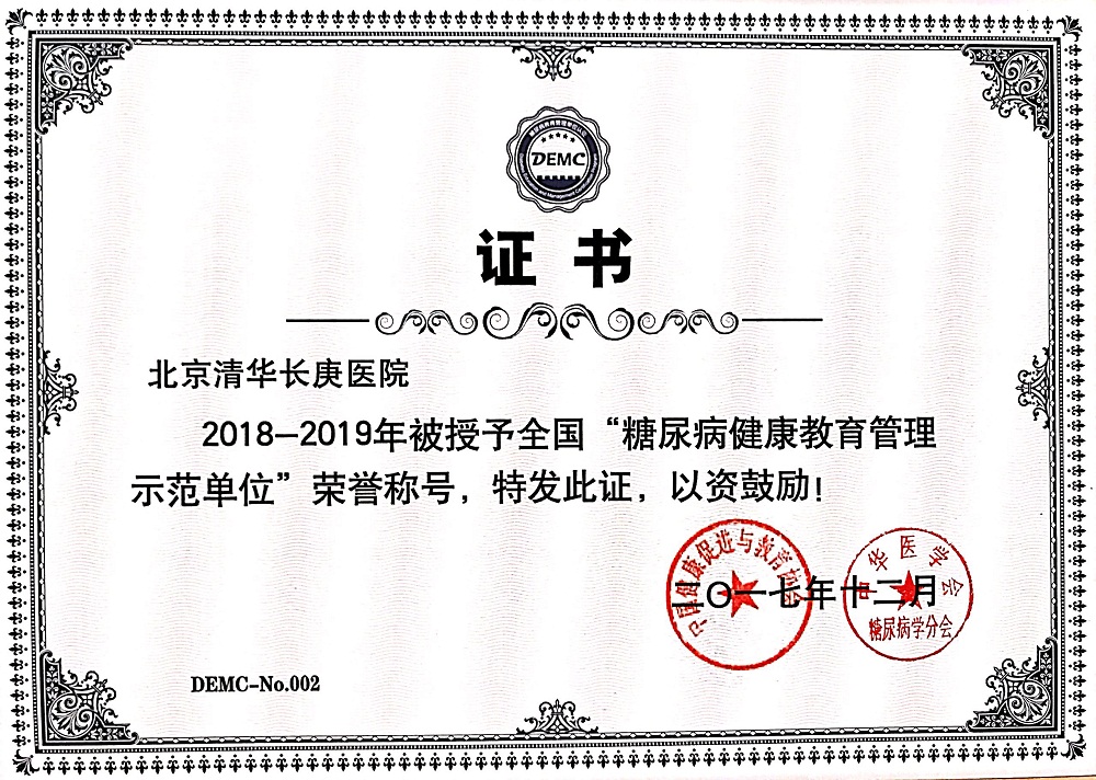 本次认证提交材料158家医院,经过严格评审,成绩在70分以上的147家医院获得了“糖尿病健康教育管理认证单位”称号,北京清华长庚医院作为成绩在90分以上的10家优秀认证单位之一被授予“糖尿病健康教育管理示范单位”荣誉称号。