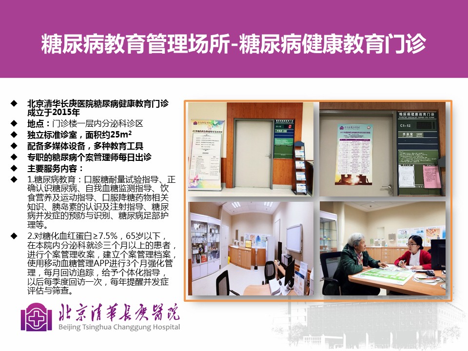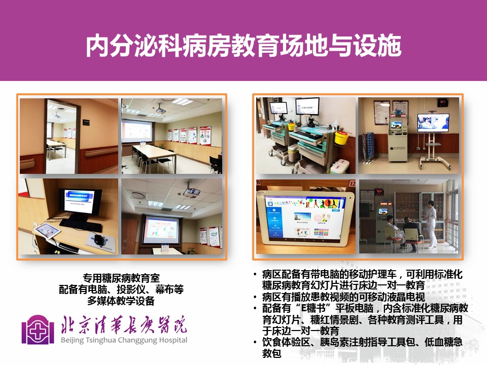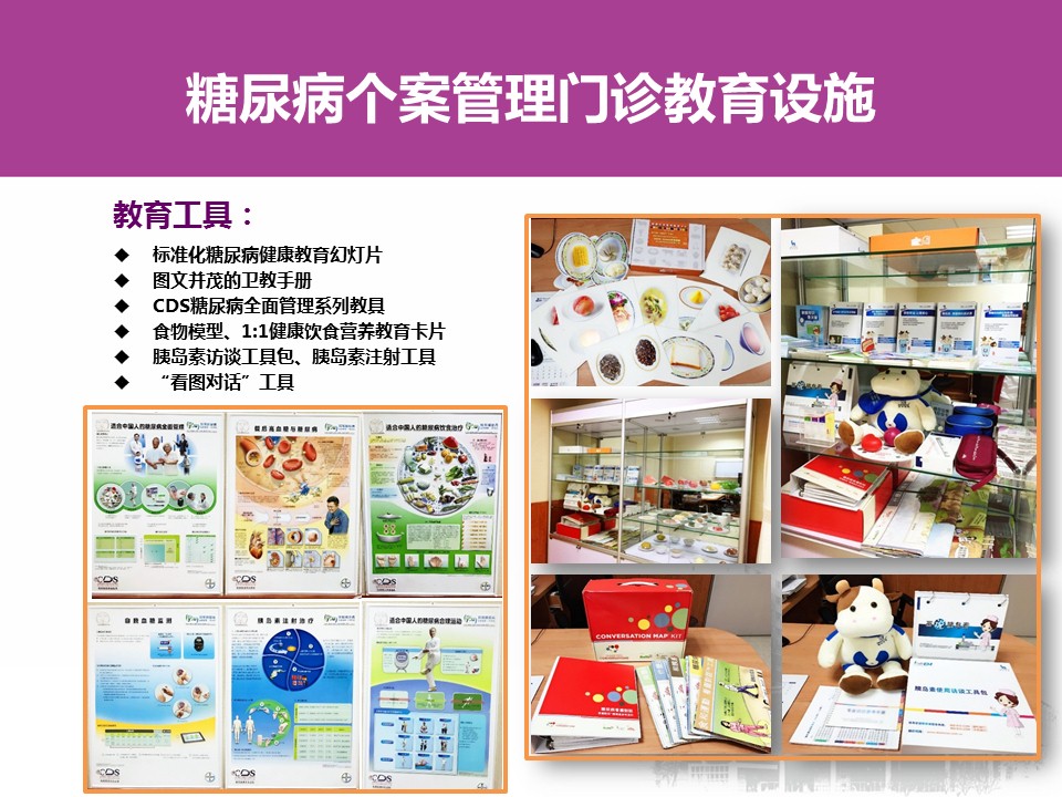 开设了独立的糖尿病健康教育门诊,配备有多媒体设备,糖尿病全面管理系列教具,由糖尿病个案管理师固定时间出诊。内分泌科病房设立固定的糖尿病健康教育教室,教育体验功能区,病区有播放糖尿病患教视频的可移动液晶电视,“E糖书”平板电脑,内含12套标准化糖尿病教育幻灯片、情景剧、各种教育测评工具,可用于床旁一对一教育。