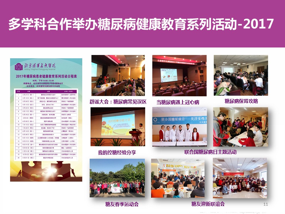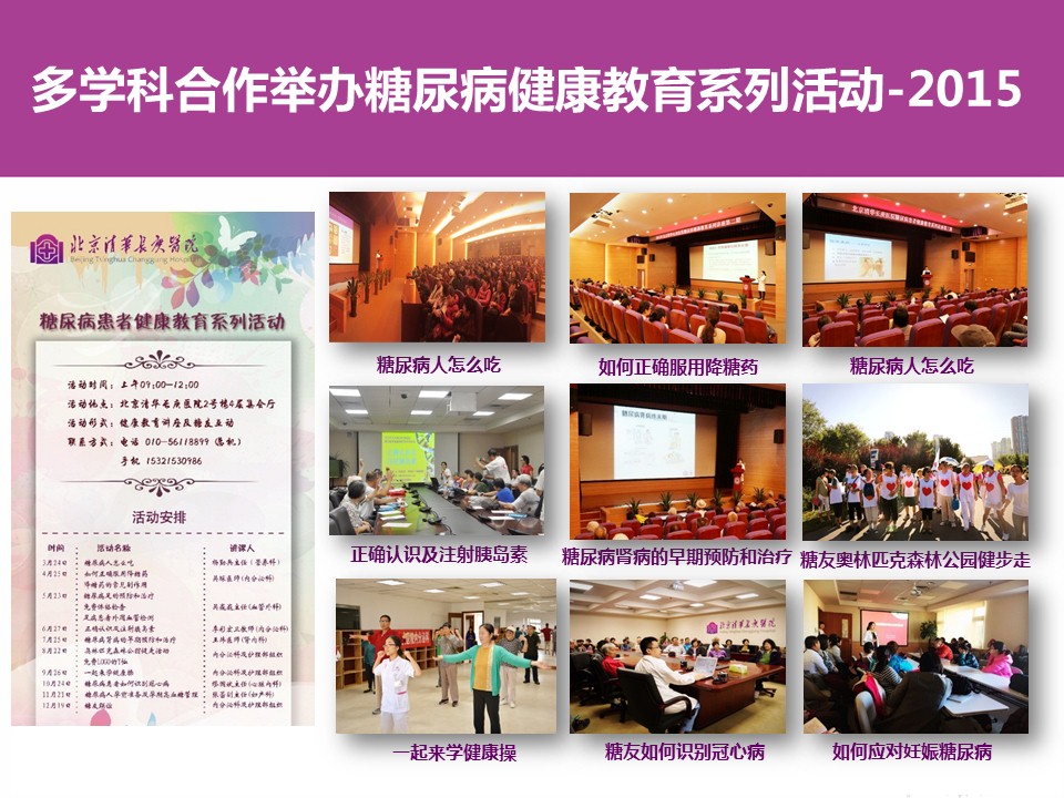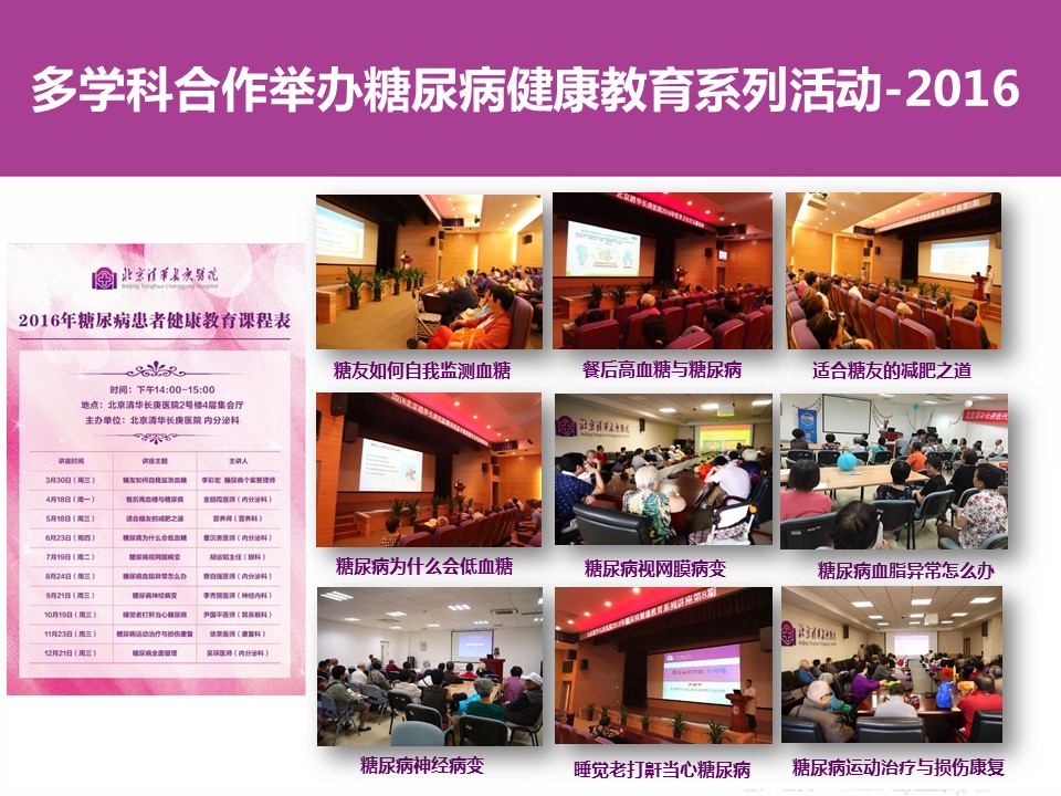 (1)大课堂教育计划:2015年正式成立北京清华长庚医院“糖友会”,并建立糖友微信群,每年策划年度糖尿病系列活动,每月1次,2017年起增加至每月2次,以科普讲座、运动会、控糖经验分享会、糖尿病日主题活动、糖友联谊会等多种形式,为糖友搭建交流与互动的平台,掌握自我管理技能,积极面对疾病,邀请包括内分泌科医师、糖尿病个案管理、营养师、运动康复师及糖尿病并发症相关科室医师等多学科团队讲授。