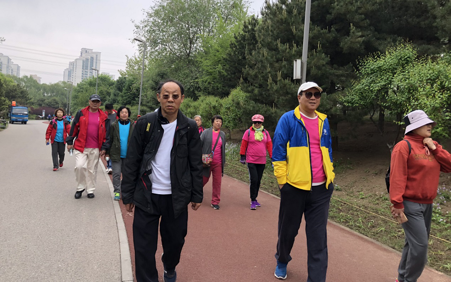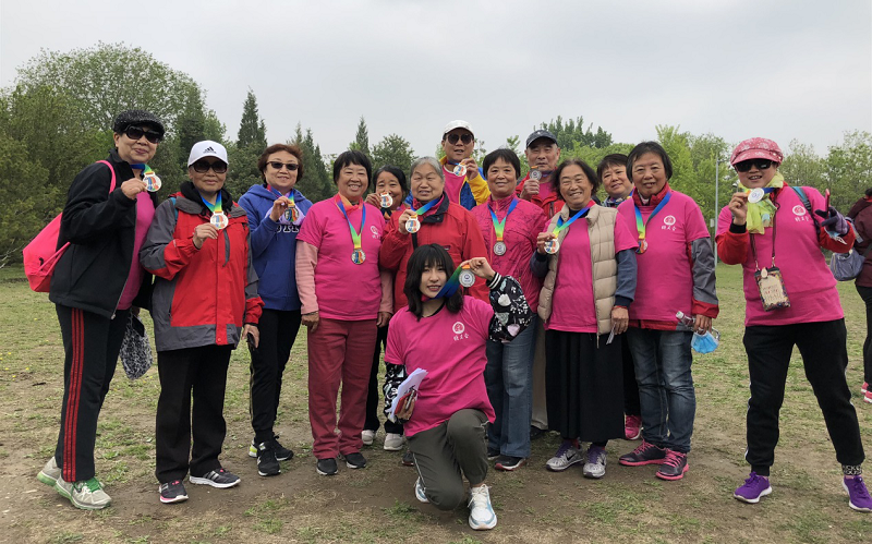 早晨,伴随着拂面的春风,叔叔阿姨们欢聚奥森,井然有序地监测运动前血糖、领取队服。在公园门口的灿烂合影定格了这美丽的瞬间。