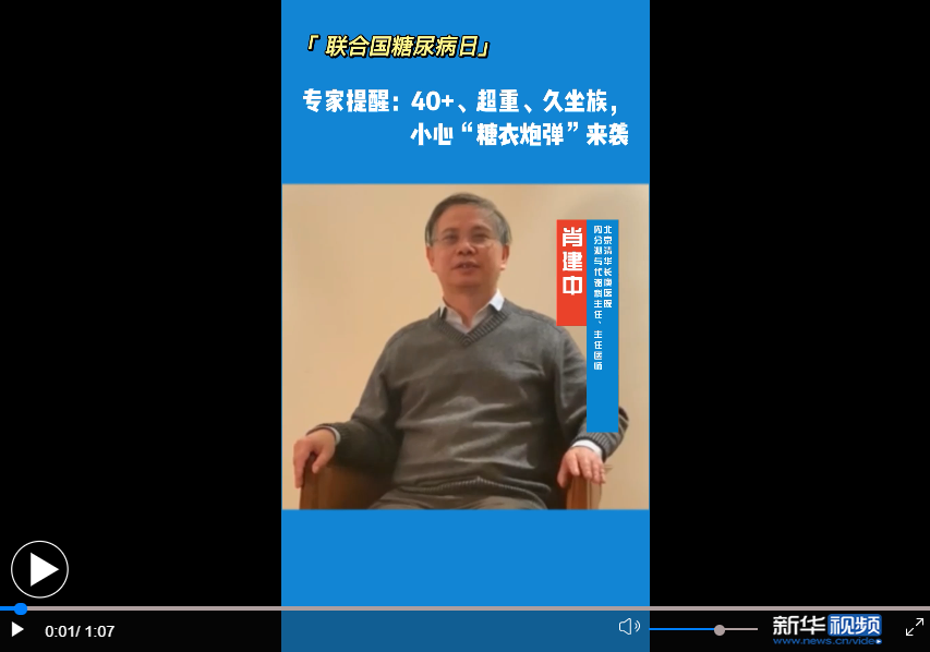 这就是糖尿病,我国约有超过1亿的糖尿病患者。在11月14日“联合国糖尿病日”来临之际,中国研究型医院学会糖尿病学专委会副主任委员、北京清华长庚医院内分泌代谢科主任肖建中教授在接受新华网专访时表示,我国糖尿病患病率高,危害严重,但由于其早期症状一般不明显,很容易被忽视,年龄超过40岁、超重与肥胖、久坐族等,都是糖尿病的“高危人群”,亟需加强健康管理,早防早治。