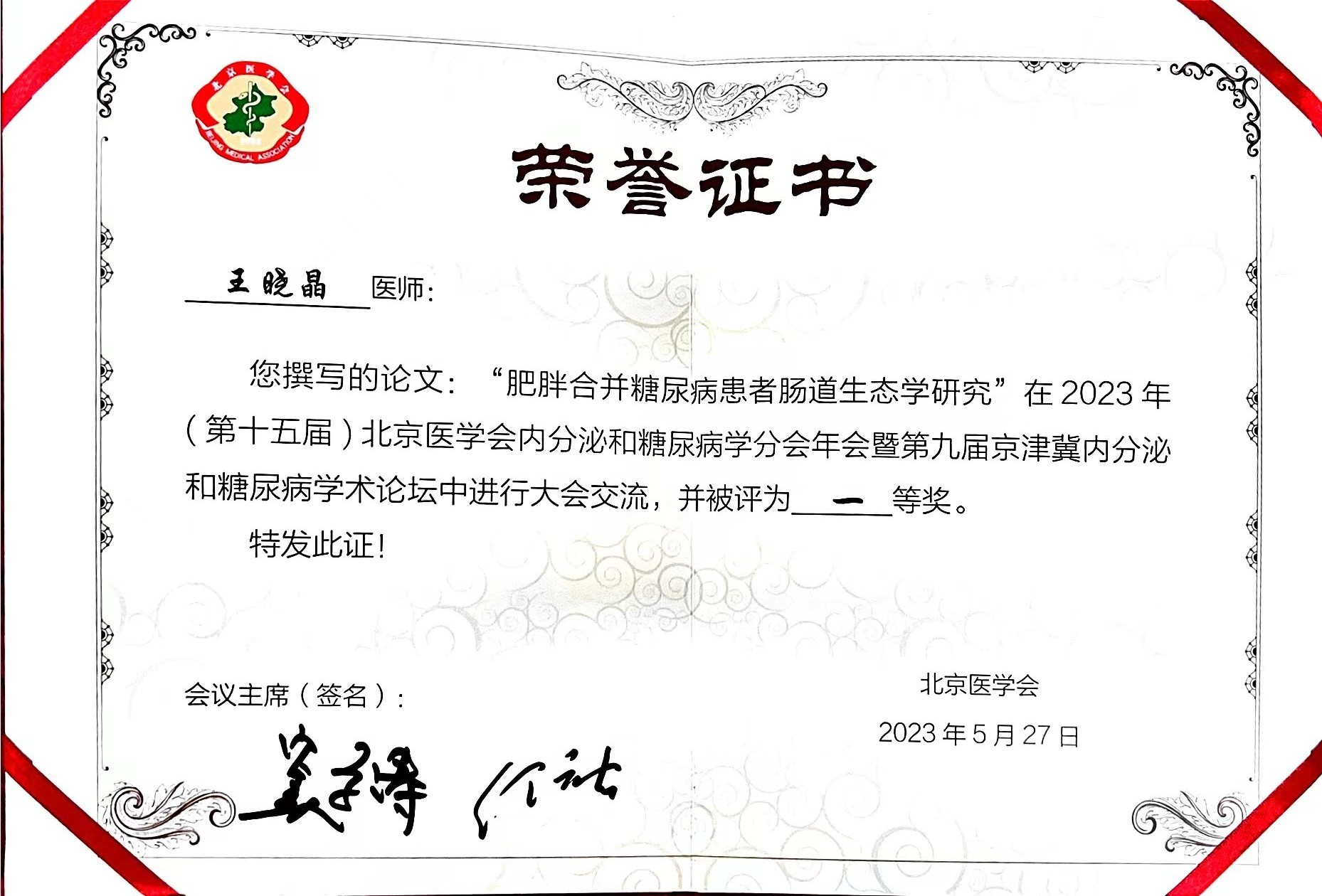 北京医学会内分泌和糖尿病分会学术年会公布了论文获奖名单。此前,内分泌与代谢科肖建中主任高度重视,积极组织部署,广泛宣传发动。我科医师积极向北京医学会投稿,踊跃参与,再获佳绩,王晓晶医师的论文“肥胖合并糖尿病患者肠道生态学研究”在第九届京津冀内分泌和糖尿病学术论坛中进行大会交流荣获一等奖,北京清华长庚医院荣获优秀组织奖。