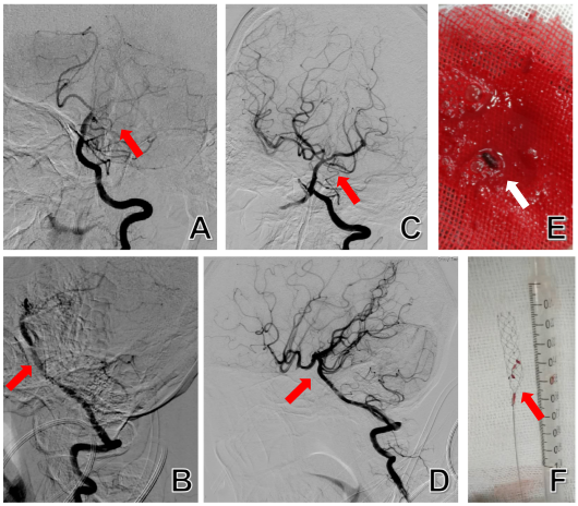 图A、B为术前基底动脉血管尖部闭塞段;图C、D为术后顺利再通血流动脉;图E为抽吸出来的血栓块;图F为Solitaire支架取出的血栓。