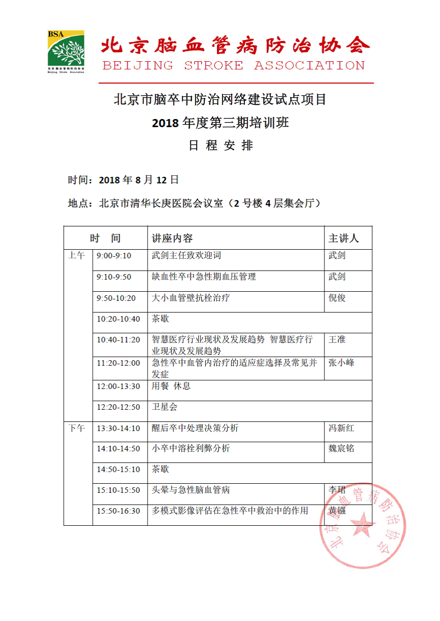 为进一步加强我市脑卒中防治能力建设,推进北京市脑卒中防治网络建设试点项目开展,按照项目规划,定于2018年8月12日召开京北脑卒中防治网络建设试点项目2018年度第三期培训会,现将有关事宜通知如下: