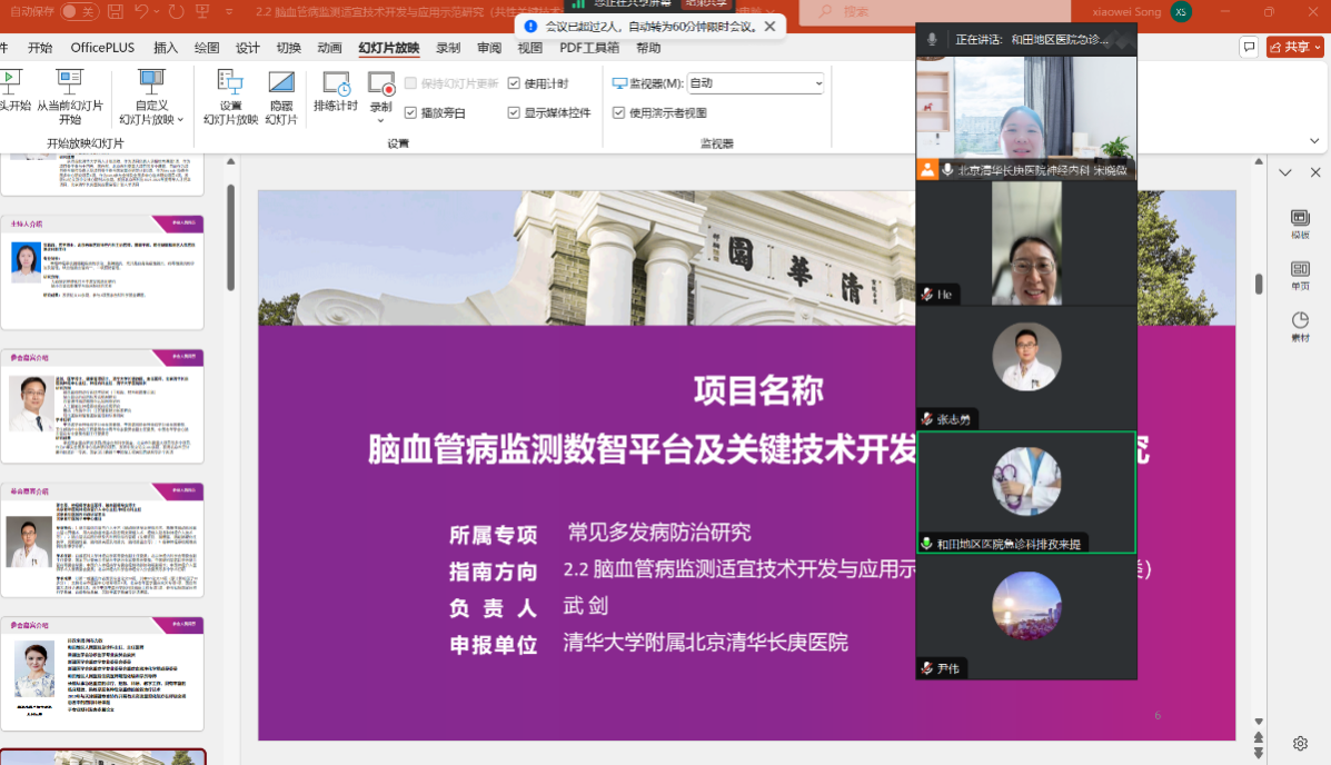 北京清华长庚医院6月20日电(神经内科 宋晓微 )2024年6月20日,国家重点研发计划“脑血管病监测数智平台及关键技术与应用示范研究”项目办公室与北京老年医院神经内科,新疆和田区人民医院急诊科召开工具包推广及示范应用沟通会。该项目由北京清华长庚医院武剑教授牵头,联合清华大学、北航及多家企业共同承担。项目启动以来,各项工作有序推进,已取得了阶段性成果。此次项目沟通会得到北京援疆指挥部及北京老年医院援疆干部贺菲菲医生的大力支持。贺菲菲医生担任和田区人民医院急诊科副主任,通过对科室现状的了解后,调研了科室需求,认识到科研是科室发展短板,当即联系了北京清华长庚医院宋晓微医师及项目负责人,希望通过项目合作,带动新疆地区科研发展。会议首先由项目管理办公室负责人宋晓微介绍参会嘉宾,并对项目概况进行了介绍,重点讲解了项目中与清华大学智能产业研究院及新华三共同开发的急诊脑血管病诊断系统和脑血管病病因诊疗决策系统,北京老年医院张志勇主任和新疆和田区人民医院急诊科排孜来提主任对项目的研究工作表示了高度认可,并一同讨论了合作的模式和细节。通过此次会议,借助项目合作,不仅推进脑血管病的智慧诊疗成果示范应用,将先进的科研成果进行转化应用,也搭建了北京与新疆地区科研合作的平台,为促进优质医疗资源下沉,推进新质生产力在脑血管病诊疗的应用,提升全国脑血管病诊治水平贡献微薄之力。这也是项目申报的初心,项目负责人武剑教授指示。