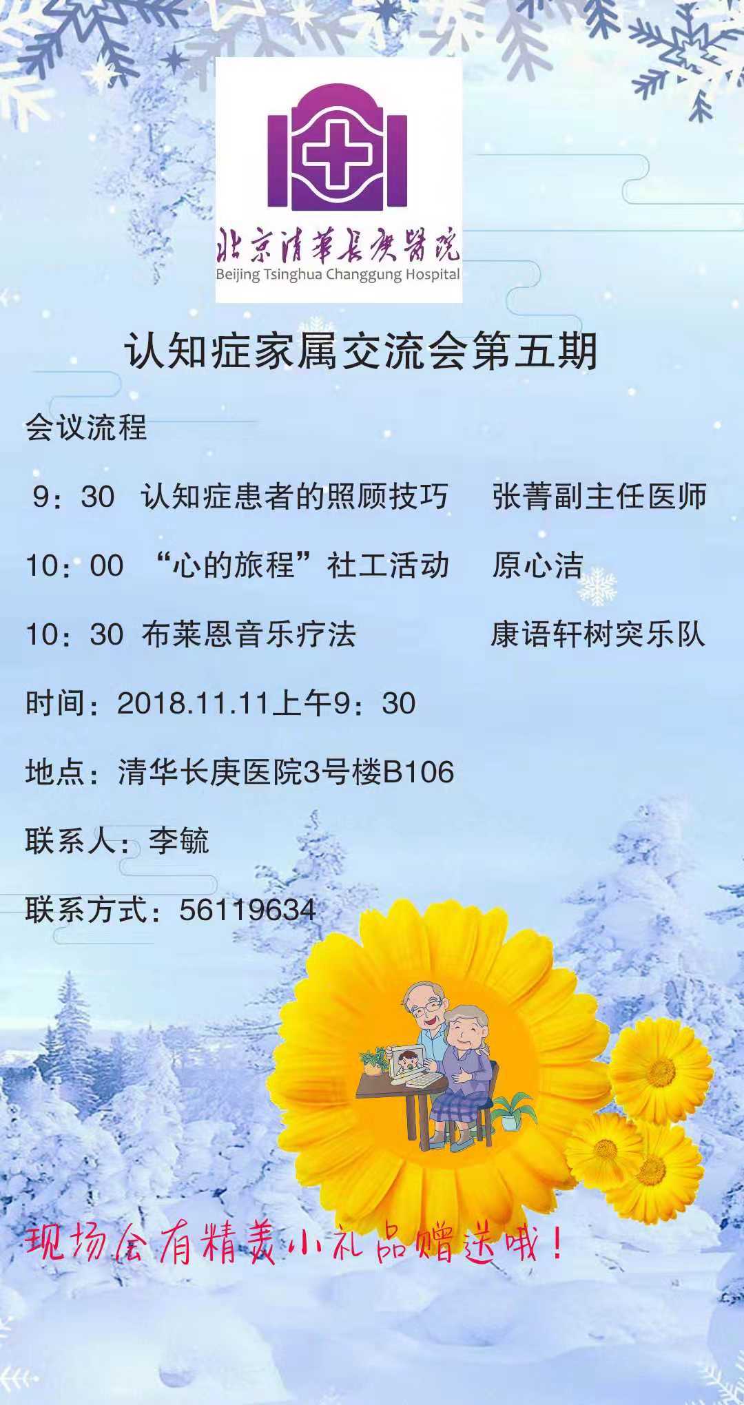 第五期认知症患者家属交流会本月11号,上午9:30,于北京清华长庚医院3号楼B106举行。本次活动仍然会给大家带来愉快的音乐以及我院社工小组组织的手工制作。