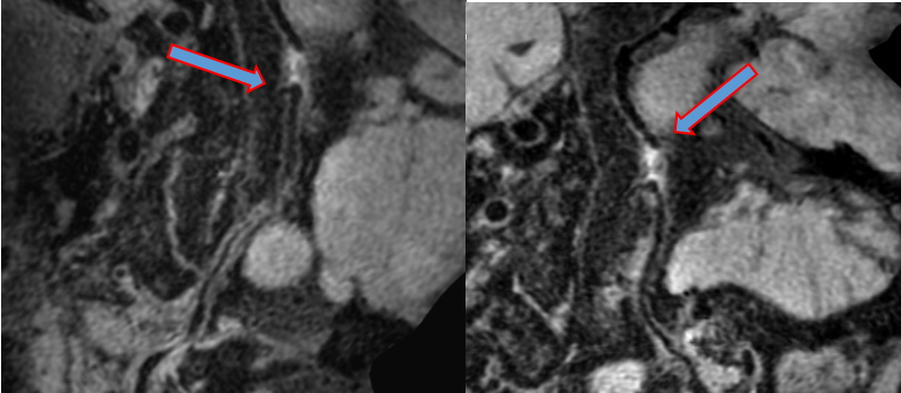 头颅HR--MRA检查,见闭塞段近端远端均有重要分支(箭头所指)