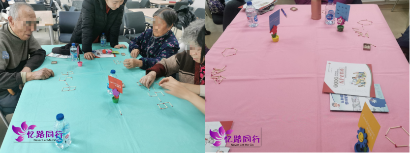 接下来的环节给老人们增加了点小难度,老人们要看着PPT上的算术公式,用火柴杆把公式摆出来,然后再听指示变动火柴杆变换公式。比如摆出“9 - 5= 5”,只能拿掉一根火柴变成一个正确的数学公式,我们还利用火柴杆摆出了三角形,四边形,五边形,最后老人们在社工的帮助下成功完成。