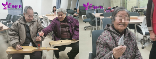 随后进入今天的正题--布恩吉他合奏时间。经过几期布恩音乐疗法的练习,大家都已经很熟悉了手中的布恩吉他,老人们跟随着社工的指挥弹唱起来。《打靶归来》《感到幸福你就拍拍手》《中国志愿军战歌》《东方红》等脍炙人口的歌曲,在老人们的指尖一一流淌。今天不一样的是,老人们要演奏《没有共产党就没有新中国》的二重弹唱。第一遍二重唱的时候老人们被社工的二重唱打乱了节奏,第二遍合唱的时候大家都聚精会神,认真得不让自己出错。最后老人们整整齐齐地弹唱出完整的歌曲,圆满完成二重弹唱任务,,脸上露出了孩童般的笑容。