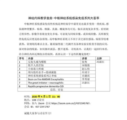 北京清华长庚医院4月2日电(神经内科 宋晓微 李秀丽 冯新红)春季除了是脑血管病的高发季节外,也是神经系统感染免疫类疾病高发的季节,尤其是在COVID-19流行的2020年春季,以“发热、头痛伴精神行为异常”来就诊的患者更是不得不让人警惕。自2月份以来,神经内科连续接诊十几例类似患者,且多数为青年人,考虑中枢神经系统感染收入院。然而,神经系统感染类疾病复杂多变,感染源种类繁多,病毒、细菌、真菌、螺旋体均可见;临床表现复杂多变,症状缺乏特异性;影像学表现也变化多端,可表现为同病异像,或异病同像,其所继发的免疫反应更是纷杂烦绕。2020年4月1日,在神经内科冯新红和李秀丽Attending医师的带领下,邀请各位住院医师结合自己主管病例进行了系统的文献回顾,并针对常见感染免疫类疾病进行了系统的复习和总结。会议采用线上和线下结合的方式进行,邀请神经中心全体医师参与讨论。针对治疗方面,神经外科苏伟、郭毅及乌优图医师等也从外科角度给予了补充。武剑主任对此次学习进行了点评和总结。通过此次学习,加深了住院医师对神经系统感染免疫类疾病的认识,开阔了鉴别诊断的思路,增加了大家对这类疾病的感性和理性认识。