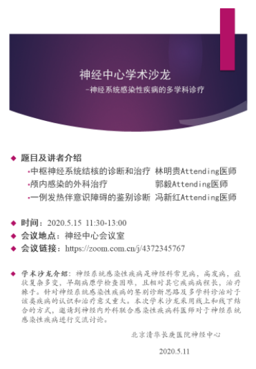 北京清华长庚医院5月18日电(神经内科 宋晓微)2020年5月15日,神经中心举办本季度第二次学术活动,此次会议的主题为“神经系统感染性疾病的多学科诊疗”。配合防疫要求,会议采用线上和线下结合的方式进行。此次会议由王劲副院长主持,神经中心全体医师及感染科医师参会。本次学术活动有幸邀请到了感染科主任林明贵教授就中枢神经系统结核的相关诊治进行了经验介绍,林主任在感染性疾病方面具有多年诊治经验,尤其是在结核的诊治过程中更有独到的认识。神经外科郭毅副主任医师就神经系统感染性疾病的外科治疗结合病例进行了详细的讲解,生动的图片更是给与会者带来了深刻的印象。最后神经内科冯新红副主任医师针对一例发热伴意识障碍疾病的诊治思路,从诊断到鉴别诊断及诊疗经过进行了叙述,重点侧重于感染性疾病的诊疗思路。会后王劲副院长,武剑主任对于此次内容进行了点评,与会者就临床诊疗中的问题进行了深入的交流。