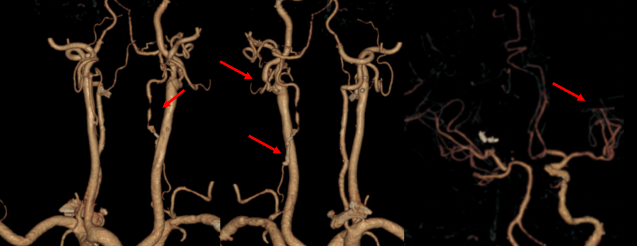 增强血管检查:红色箭头部分为右侧颈内动脉陈旧闭塞,左侧颈动脉狭窄,左侧椎动脉狭窄