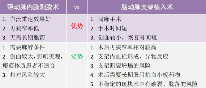 对于符合治疗指征的有症状颈动脉狭窄的患者,多数国际指南推荐首选CEA手术,因为有充足证据证明CEA手术可以更好的控制围术期乃至远期脑卒中及死亡率。对于符合治疗指征无症状颈动脉狭窄的患者,多数也是建议CEA手术,将脑动脉支架(CAS)作为备选治疗。