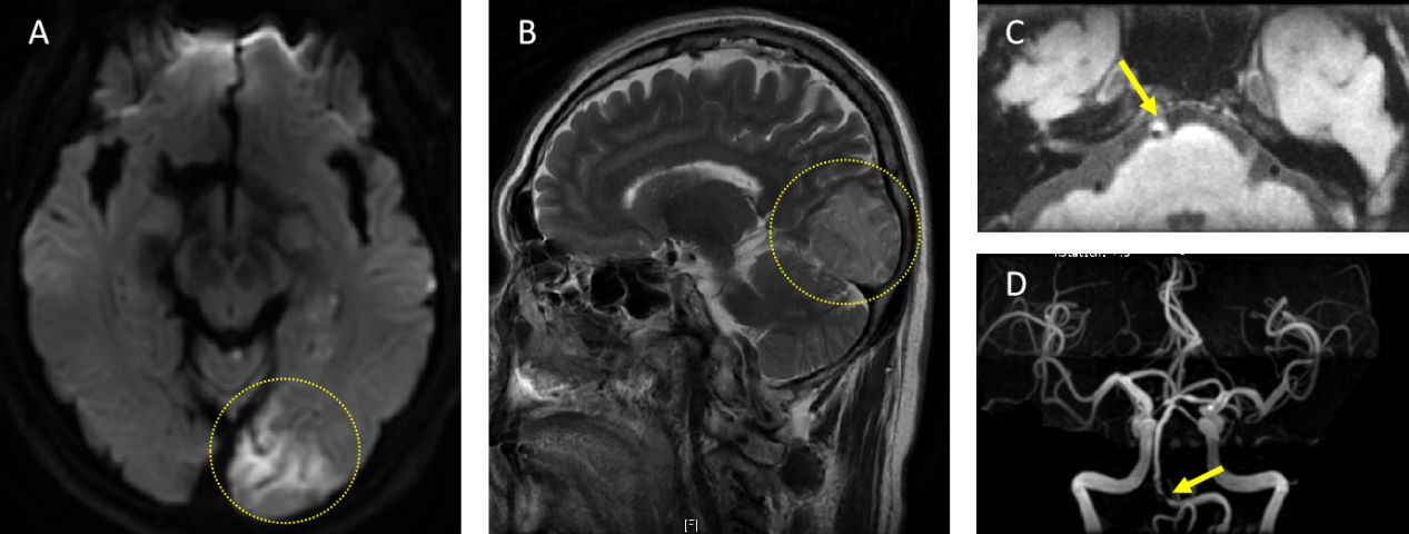 图1:A. 头颅核磁平扫DWI序列轴位相可见左侧枕叶新发梗死病灶 B. 头颅核磁平扫T2-Flair序列矢状位相亦可见枕叶梗死病灶 C. 头颅MRA高分辨序列可见椎-基底动脉汇合部不稳定斑块形成 D. 头颅MRA可见椎动脉V4段—基底动脉起始段重度狭窄