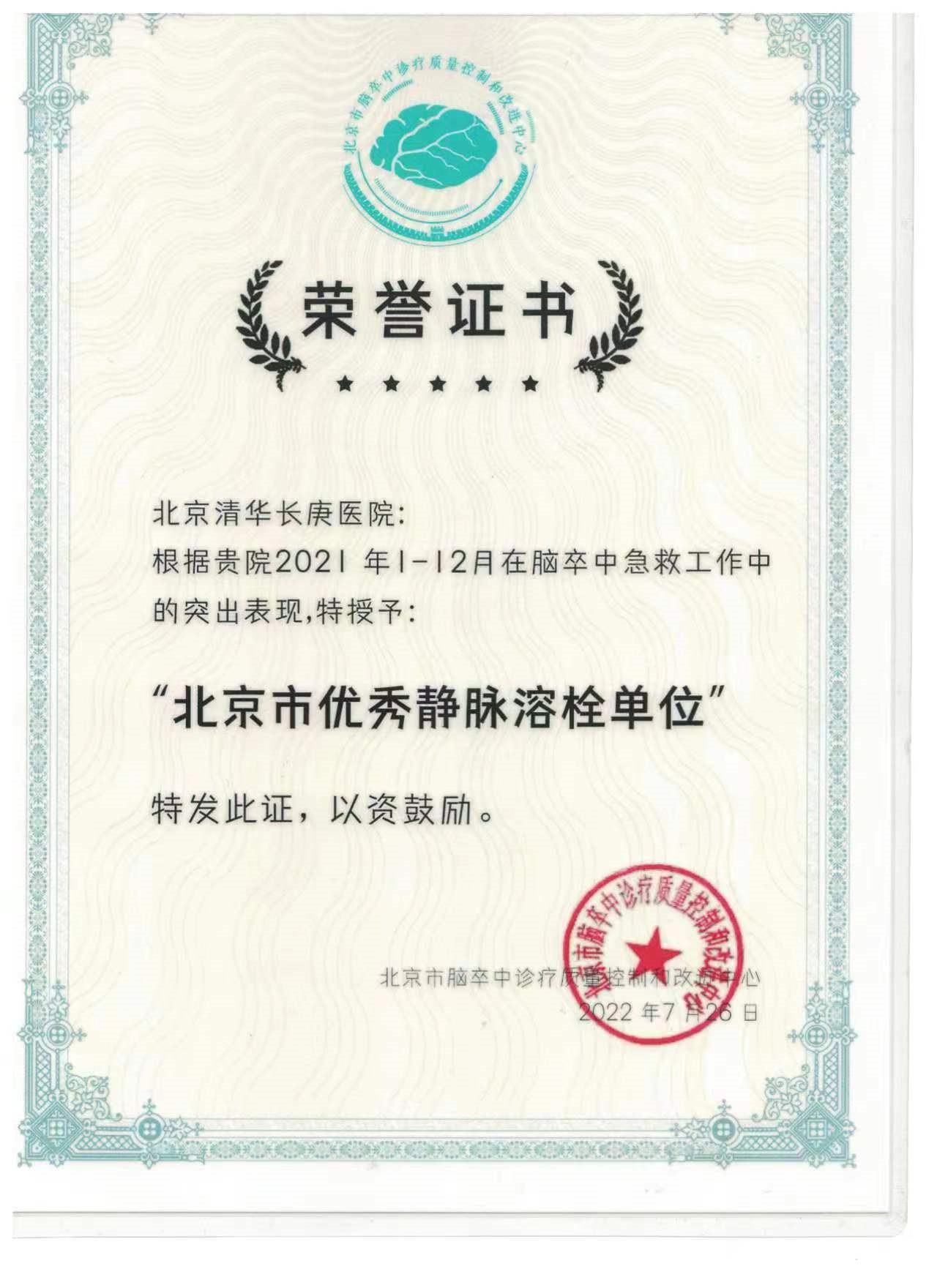 北京清华长庚医院8月2日电(神经内科 王玥明)2022年7月25日,北京清华长庚医院获得由北京市脑卒中诊疗质量控制和改进中心颁发的2021年度“北京市优秀静脉溶栓单位”荣誉奖项。