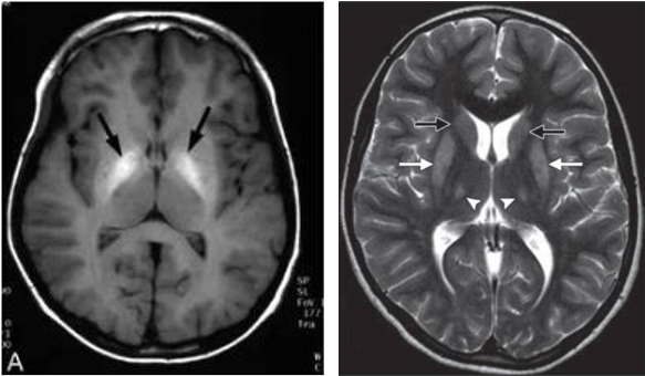 3.头颅影像学:头颅磁共振检查可以看到双侧对称分布的位于豆状核、基底节的病灶。