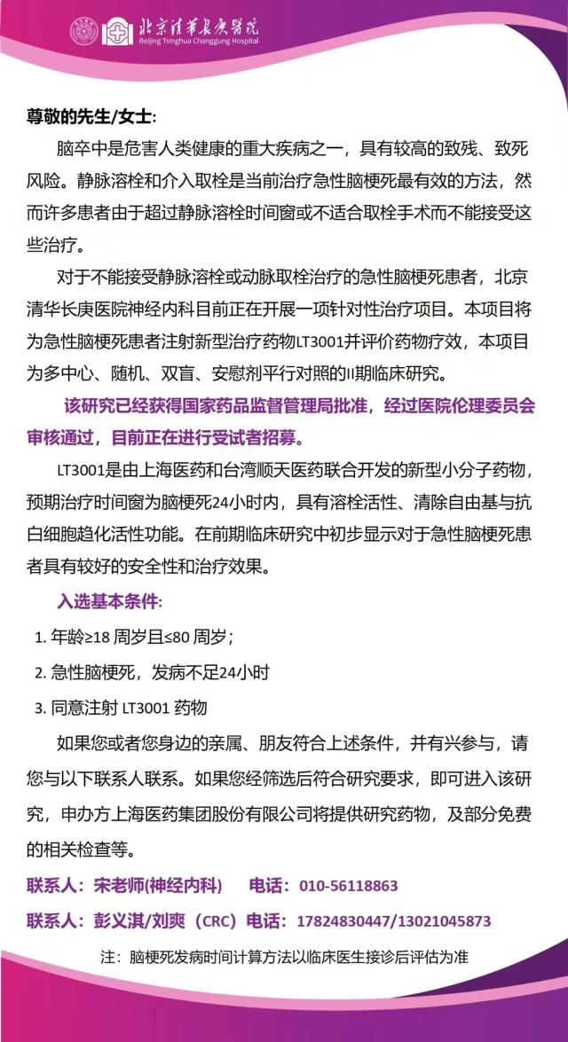 受试者招募|急性脑梗死静脉注射药物临床研究