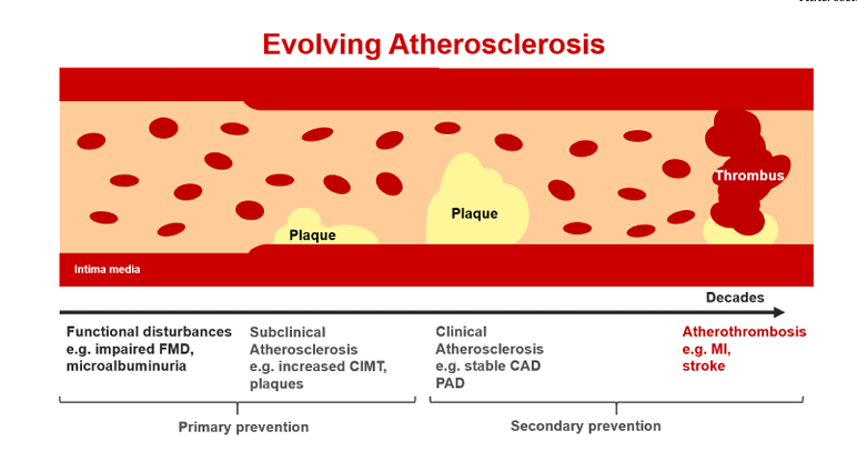 ① 影响亚临床动脉粥样硬化(颈动脉粥样硬化和下肢动脉粥样硬化)进展和消退的因素[4]:在对一组合并亚临床动脉粥样硬化人群长达6年的随访中,1/3的患者出现了亚临床动脉粥样硬化的进展,8%的人群出现了亚临床动脉粥样硬化的消退,其中升高的低密度脂蛋白胆固醇水平(LDL-C)和收缩压对亚临床动脉粥样硬化进展的影响在年轻人中更显著。