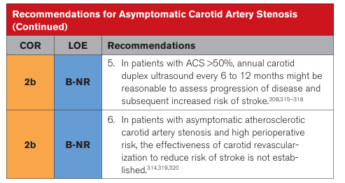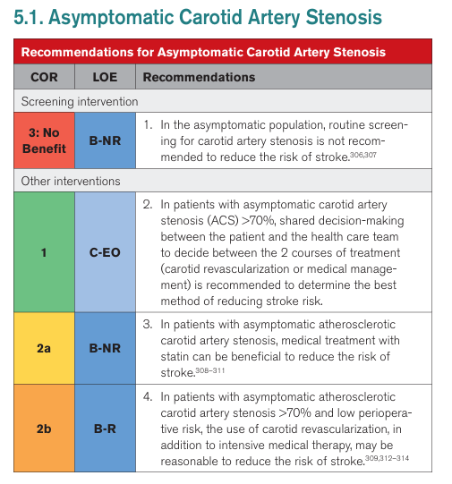 我们先来看看2024年美国心脏协会/美国卒中学会发布的卒中以及预防指南中关于颈动脉粥样硬化部分的推荐[2]。