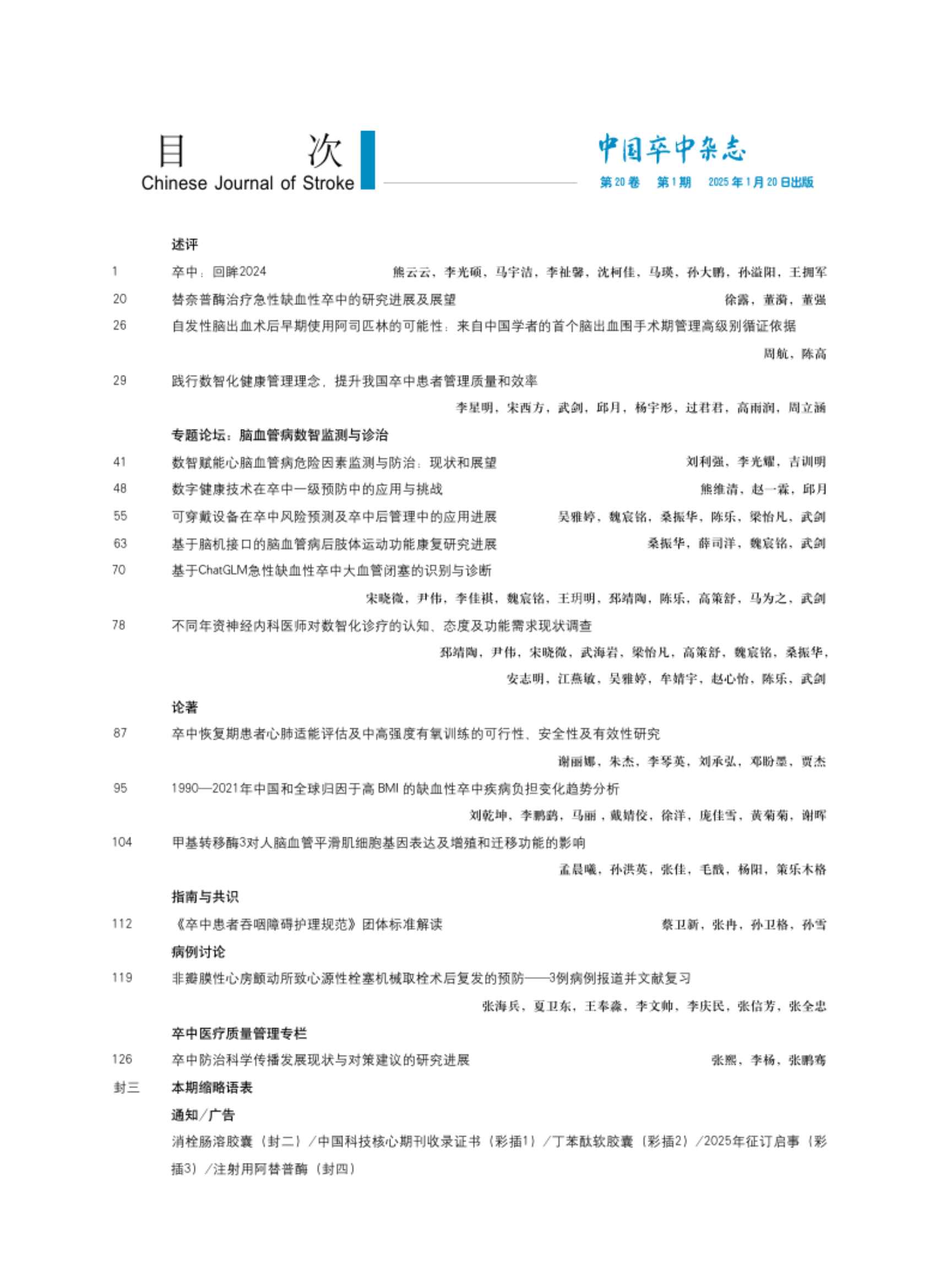 北京清华长庚医院1月22日电(神经内科 宋晓微)新春伊始,由武剑教授作为特邀执行主编牵头撰写的脑血管病数智监测与诊治的专题论坛在中国卒中杂志2025年第一期见刊。本专题论坛依托武剑教授牵头的国家重点研发计划-脑血管病监测数智平台及关键技术开发与应用示范研究。项目自获批至今经过团队1年余的攻关,整体内容有序推进,部分内容有了初步的成果。在本次专刊中,围绕数智技术在脑血管病危险因素监测、一级预防及健康管理,可穿戴设备用于卒中风险预测及卒中后管理、大模型用于急性缺血性卒中大血管闭塞的识别、脑机接口在卒中后康复的应用及目前临床医师对数智化诊治认识和需求等方面展开讨论和阐述。专题覆盖了人工智能技术在脑血管病筛-防-诊-治-康疾病全周期,也对人工智能技术应用脑血管病诊治现状、态度及未来趋势和政策进行了探讨。专题内容由项目牵头和参与团队共同完成。