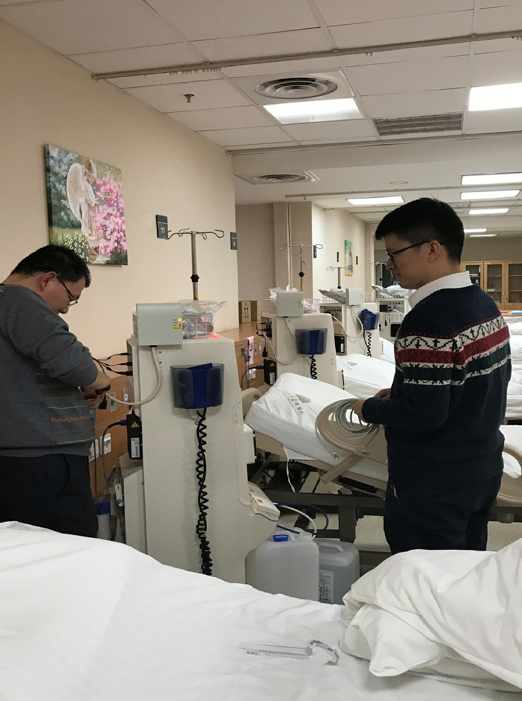 业务内容:血液透析水处理、透析机及相关医疗设备的管理、消毒、保养和维护。曾在厦门长庚医院培训1年、北大医院血液净化