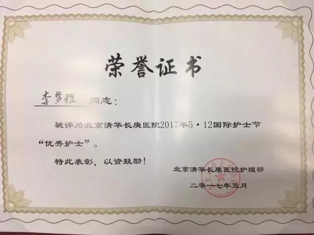 对于获得2017.5.12国际护士节“优秀护士奖”,她的获奖感言很朴实:“在清华长庚医院,随着医院的成长,我每天都能感觉到自己点点滴滴的进步,到清华长庚医院透析室2年来,在李月红主任和武向兰护士长的带领下,每天都在学习中成长,不断用理论知识和专业技能充实自己,努力使自身各方面都更加优秀,只有业务水平越来越高才能更好地服务于患者。”
