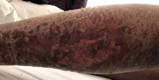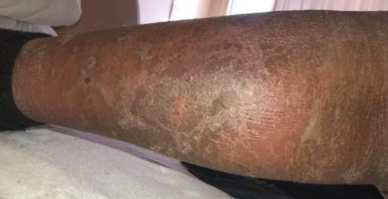 北京清华长庚医院肾内科(吕佳璇 李月红)病房收住了一位31岁男性,有肾功能不全,大量蛋白尿,伴高血压和大量胸腔积液,查体左下肢皮肤重度感染,不除外丹毒、疱疹病毒、细菌混合感染,查血肌酐120umol/l,24h尿蛋白6.2g。患者因左下肢疼痛剧烈,不能行走。问病史该患者1年半前诊断肾病综合征、局灶增生性IgA肾病,当时就有下肢的丹毒感染,一直应用激素和环磷酰胺免疫抑制剂治疗。入院后左下肢皮肤分泌物培养,居然有5种细菌(无乳链球菌、金黄色葡萄球菌、阴沟肠杆菌、恶臭假单胞菌、纹带棒杆菌)和CMV病毒感染!经过2周积极抗感染及每天换药治疗,皮肤感染好转,疼痛减轻,蛋白尿减少,可以行走了。