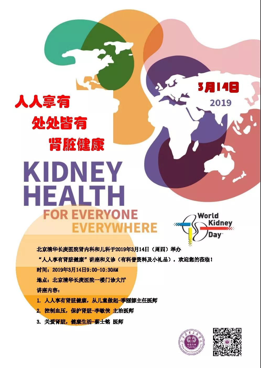 北京清华长庚医院肾内科和儿科于2019年3月14日(周四)举办“人人享有肾脏健康”讲座和义诊(有科普资料及小礼品),欢迎您的莅临!