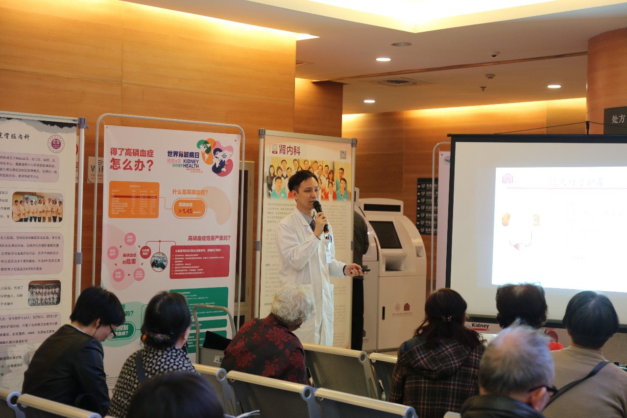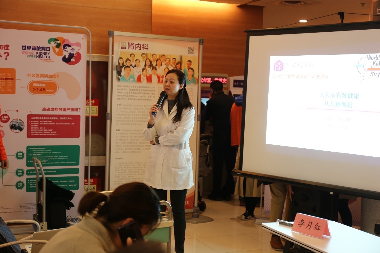 肾内科李月红主任首先介绍,目前肾脏病发病率10.8%,高血压、糖尿病的高患病率造成了肾脏病的激增。50.5%糖尿病、27.1%高血压、33.7%有肾病史的患者会发生慢性肾病,20%的急性肾衰是由药物引起,20.1%的超重或肥胖人群患有慢性肾病。不良的生活方式,如每天吸烟超过20支肾功能下降增快97%,经常熬夜人群发生慢性肾病的概率会增加2倍。但肾脏病却很隐匿,初期往往没有症状,很容易被忽视,就诊时往往病情偏慢性且比较严重,希望通过每年的肾脏日宣传活动,提高对肾脏病的警觉,达到人人享有肾脏健康的目的。