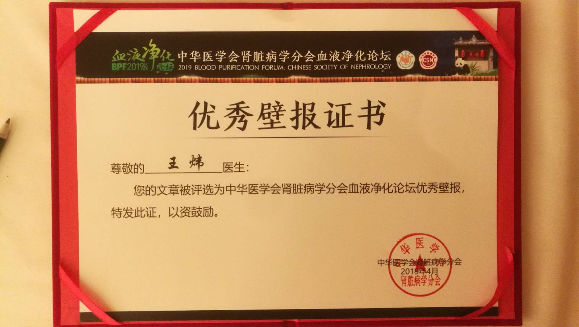 肾内科庄震副主任医师、武向兰护士长、张东敬护士长、吕佳璇主治医师、王冲住院医师、杨画护师、徐帅峰技师参加了本次论坛。肾内科投稿8篇,其中英文壁报1篇、中文壁报4篇、论文交流3篇。利用我院自主研发的血液透析信息化管理系统数据,李月红主任、王炜医生的文章“糖尿病维持性血液透析患者心脑血管事件及并发症”被评为优秀壁报,壁报交流现场热烈,通过与高水平医院的交流,展示我院在血液净化领域的快速发展,体现了国内外专家对北京清华长庚医院的厚爱和肯定,对于刚成立4年的医院,实属不易。