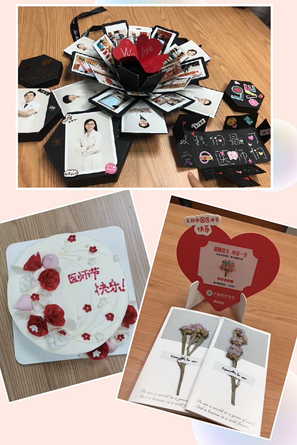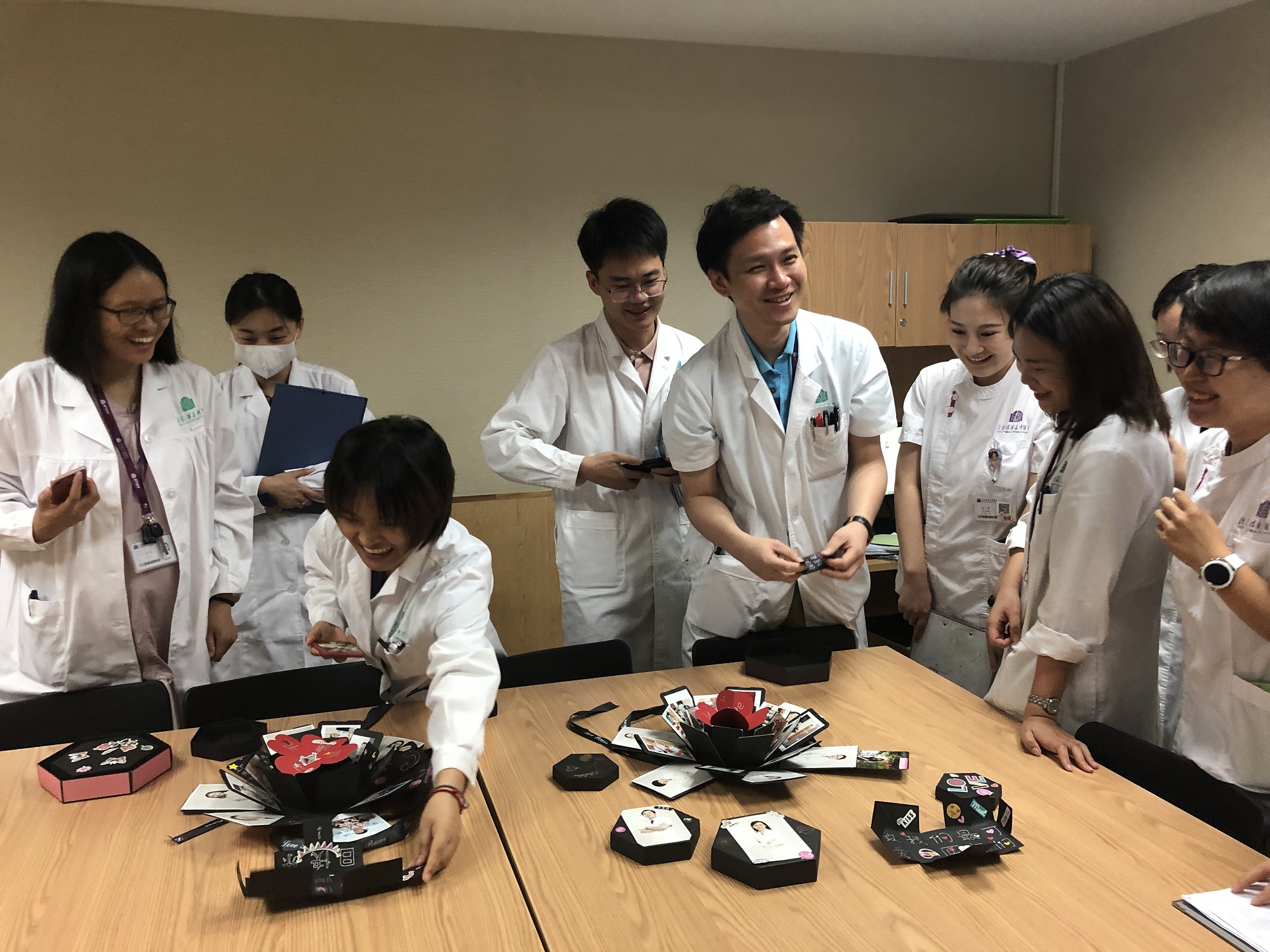 早8点李月红主任准时出现在病房,与王冲医师、蔡士铭医师、张东敬护士长等共同进行医护早交班。交班后张东敬护士长带领13A全体护士为医生们赠送了全手工制作的医生相册礼盒,祝大家医师节快乐!