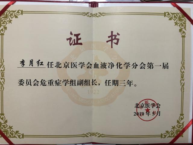 为更好将血液净化技术用于危重症患者的治疗,会上成立了血液净化学分会第一届委员会危重症学组,中日友好医院李文歌教授和北京友谊医院刘文虎教授担任名誉组长,北京医院毛永辉主任任组长,我院李月红主任、中日医院张坚主任、航天中心医院肖跃飞主任、天坛医院周亦伦主任、北京潞河医院李忠心主任任副组长。