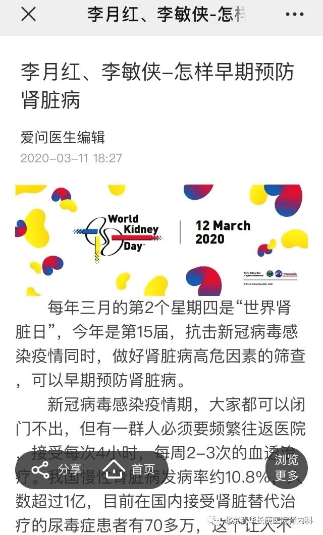 李敏侠主治医师在腾讯爱问医生平台撰写科普《怎样早期预防肾脏病》,不到24小时,点击率10万以上,强调高血压、糖尿病、肾脏病家族史、超重和肥胖、肝炎病史、自身免疫性疾病、长期用药史、肾病史、早产出生低体重、反复泌尿系感染、睡眠呼吸暂停、美白用品、不良生活习惯等,都是肾脏病的高危风险,要做到早预防、早诊断、早治疗。王冲住院总医师在发热门诊同时,撰写微信科普“盐与肾脏病”,强调肾病患者更要控盐。其他医师分别在发热门诊、急诊留观、病房、透析室介绍肾脏病的预防。