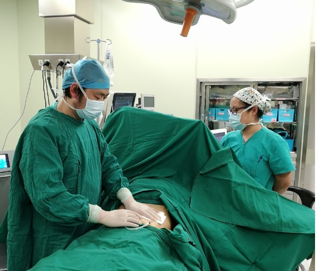 手术当日,老宋心情紧张,血压升到160/90mmHg,病房张东敬护士长一直陪伴在旁劝解安慰。手术室安排了第一台手术,麻醉科俞晨副主任医师、严思益医师有条不紊的进行心电监护、静脉降压、术中镇静。巡台田宇护士时刻关注着静脉通路和血压。肾内科庄震副主任医师和肝胆外科副主任曾建平副主任医师精心准备,密切配合,切皮、分离、止血、置管、缝合、皮下隧道,45分钟手术顺利完成,腹透管引流通畅。术后老宋说:“迷迷糊糊也不疼,觉得打个盹,迷一会儿手术就结束了!”。三天后,老王同样接受了局麻加强化麻醉下的腹透管置入手术,手术非常顺利。