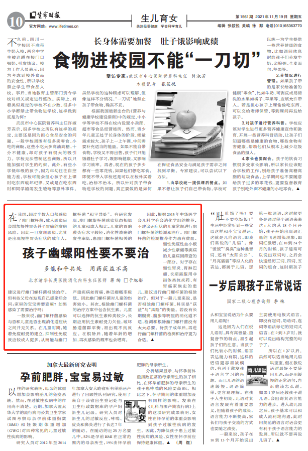 因此,根据2015年中华医学会儿科学分会消化学组的推荐,不建议无症状的儿童常规进行幽门螺杆菌的检测和治疗。幽门螺杆菌的检测推荐作为患有贫血、慢性免疫性血小板减少性紫癜等疾病的儿童病因筛查的一部分。对于存在慢性胃炎、胃淋巴瘤、长期需服用非甾体类抗炎药、有胃癌家族史的患儿,建议进行幽门螺杆菌的根除治疗。但对于一般儿童来说,是否根除幽门螺杆菌,其实是“获 益”与“风险”的衡量。若没有长期腹痛、腹胀等明显的消化道不适,检测和根除幽门螺杆菌没有太大必要。待孩子成年后,再进行幽门螺杆菌的检测和治疗更为合适。▲