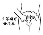 (二)腹部按摩: 身体略向前倾并依结肠解剖位置,以手指顺时钟方向给予腹部按摩,每星期五次,每次15-20分钟,可增加肠胃蠕动次数,促进排便(有腹部阻塞、腹部肿瘤、腹部外科手术或放射线治疗等,不适合进行腹部按摩)。