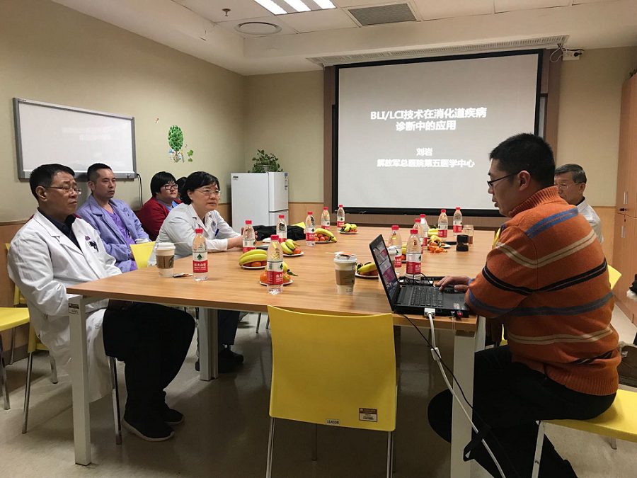 刘岩教授在我科访问期间讲解并演示了BLI(blue laser imaging)及LCI(linked color imaging)两项新技术在内镜检查中的应用,分享了他在提高消化道早期肿瘤发现率中的临床经验,并通过座谈会的形式,与消化科全体医师进行了广泛的经验交流。刘岩教授团队在LCI新技术内镜应用方面已达到国际领先水平,成功将内镜下病变图像与视频信号分析相结合,量化内镜观察下颜色信号信息,结合组织病理学表现,提出了“purple mist” 的概念以及这种内镜下表现在早癌诊断中的应用价值。刘岩教授详细介绍了临床科研的思路及成功经验并与各位医师尤其是青年医师进行了热烈的讨论,向青年医师提供了临床科研的新思路,青年医师均表示受益匪浅。我科与307医院消化科均为成立不久的新科室,刘岩教授带领的同样年轻的团队已取得了较大的科研成就,是我科青年医师学习的榜样,这次学术交流为我们带来了很多思考,对日后我科开展临床科研工作有很大的帮助。
