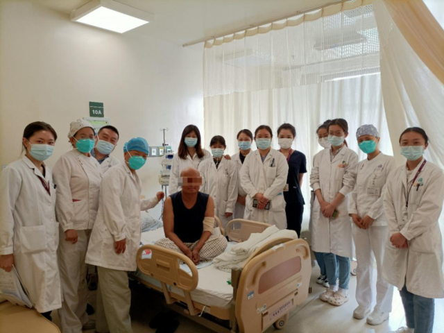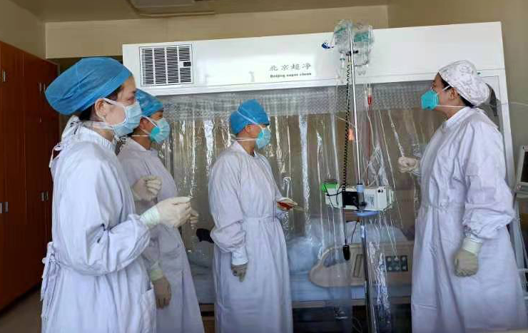 李利红首先为患者进行4个疗程标准诱导方案化疗,达到骨髓瘤完全缓解(CR),于今年初启动造血干细胞动员及外周血干细胞单采术,遵照国际指南推荐,后进行2个疗程巩固化疗;3月开始标准剂量预处理,血液肿瘤科医护团队启用正压病房与无菌层流床相结合,为患者提供全环境保护,并严密监测、精心护理,中心供应室全力配合,对患者相关物品进行消毒,4月2日回输自体造血干细胞,正式启动移植,移植后13天,患者血象恢复,标志自体造血干细胞植入成功。