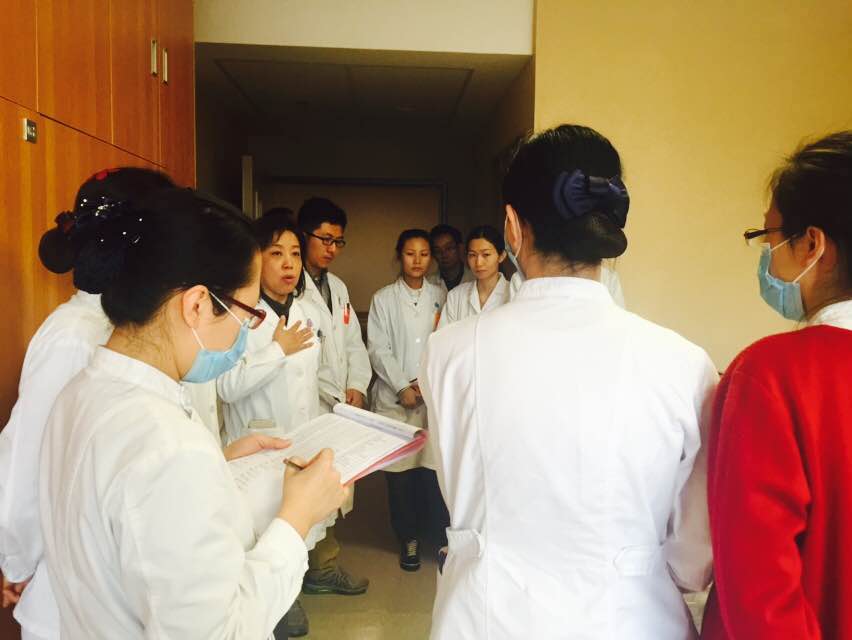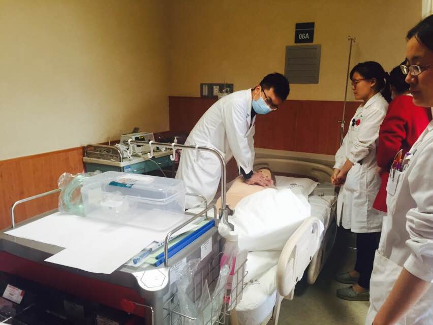 演练当日,下午3时许,8B病区16A病床病患门口急救灯突然亮起,“家属”通过呼叫器大声呼喊:“快来人呀,16A病人没呼吸了…”,瞬间,住院医师及当班护士快步进入病房,迅速判断患者情况后,立即对患者实施心外按压,并同时呼叫Attending主治医师及责任护士等到场,共同启动了这场和时间赛跑的生命保卫战,“建立静脉通道,心脏除颤器准备,联系麻醉科行气管插管,肾上腺素1mg 静注,200J电复律1次,继续胸外按压…气管插管成功…200J再次电复律…患者心跳回复,监测血压,血氧,心电活动……”团队的合作又一次与病魔抢夺回了患者的生命。急重症及内科督导赵赵文静亲临现场,观摩了整个演练过程,同时就抢救过程提出了合理化建议,最后张萍总结分析了演练过程中的不足与欠缺,修正后,重复上述场景又让不同的医师与护士进行演练,每一位住院医师及护士都得到了锻炼,“原来我们还有很多不足,这次演练太重要用了,尤其对于我们住院医师,再遇到紧急情况,不再会手忙脚乱了”神经内科住院医师王也说。