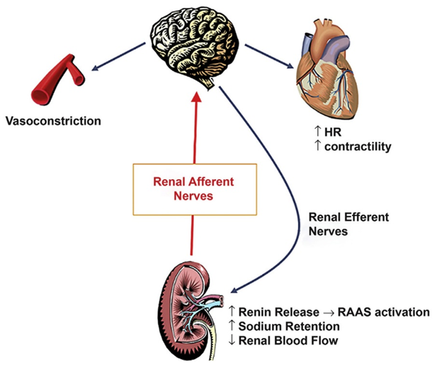 人体血压在神经系统、循环系统、内分泌系统等多系统复杂交互作用下波动,而肾脏在血压调节中具有核心作用。肾脏交感神经兴奋性增高会导致传入神经(Afferent Nerves)和传出神经 (Efferent Nerves)收缩肾血管、加强肾小管水钠重吸收、增加球旁细胞肾素分泌等,进而使得人体血压升高。