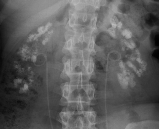 1.KUB(尿路平片):肾乳头和(或)锥体区可见簇状、扇形排列或放射状分布的多发高密度影。