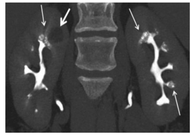 3.CT:①平扫期: 乳头区及髓质密集簇状的小结石。②增强(排泄)期: 显示扩张的集合管呈 “囊状/葡萄串样” 或 “花瓣征” ,内部多有散在结石填充。